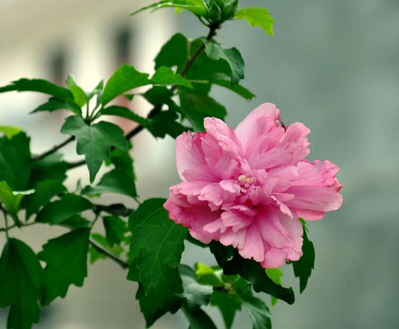 木槿牡丹屬于木本花卉,開粉紅色或者淡紫色的花朵,是重瓣的品種,屬于落葉灌木,高度大概3~4米左右。